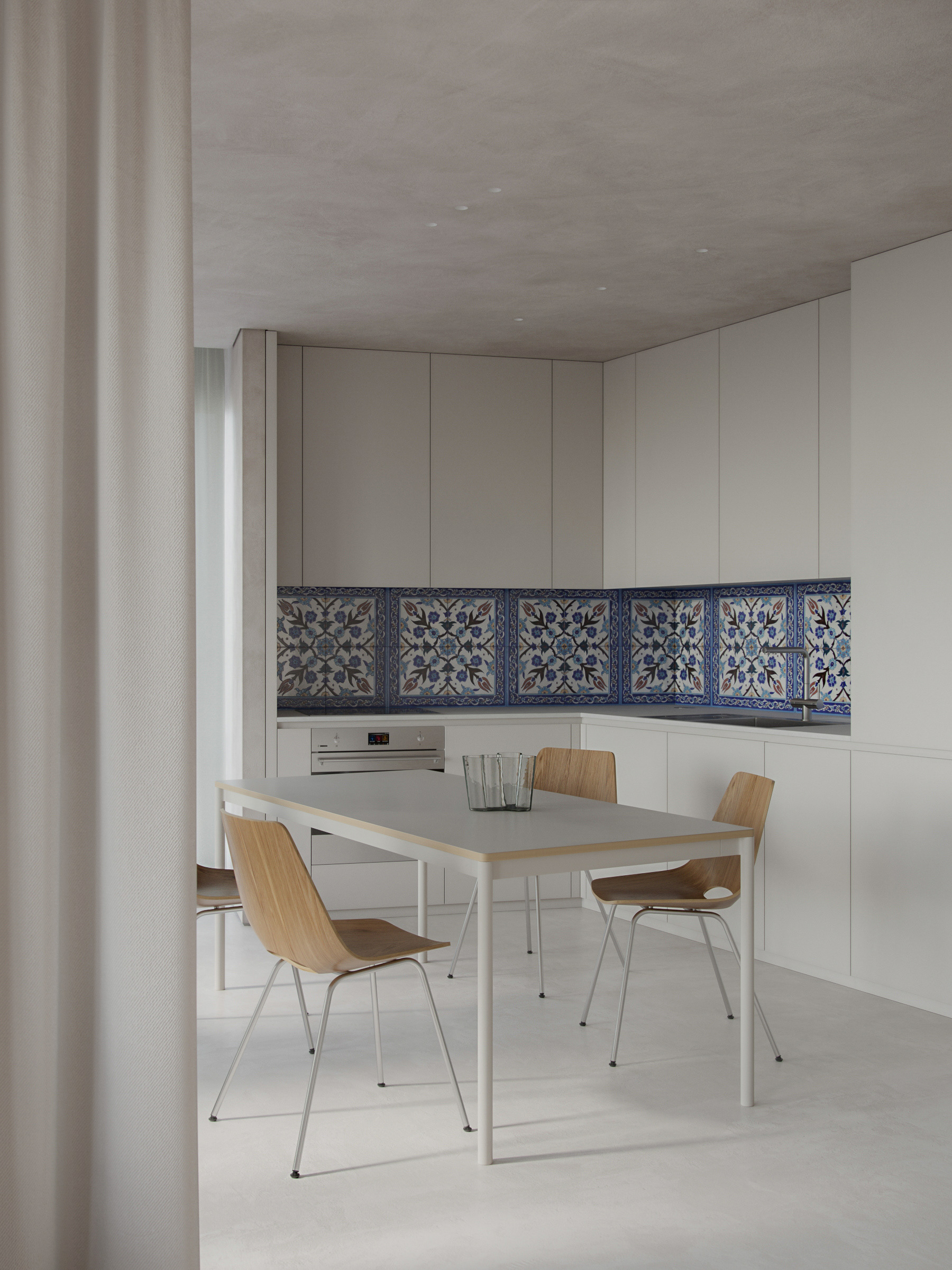 Monochrome build-in kitchen with a blue emphasis - ceramic handmade painted tile with Middle Eastern pattern. In the center of kitchen area, chairs S 661 made in molded oak plywood designed by Günter Eberle and produced by Thonet, discreet Base table designed by Mika Tolvanen for Scandinavian brand Muuto and The Aalto Vase, also known as the Savoy Vase, created by Alvar Aalto and his wife Aino that has become an internationally known iconic piece of Finnish design.
